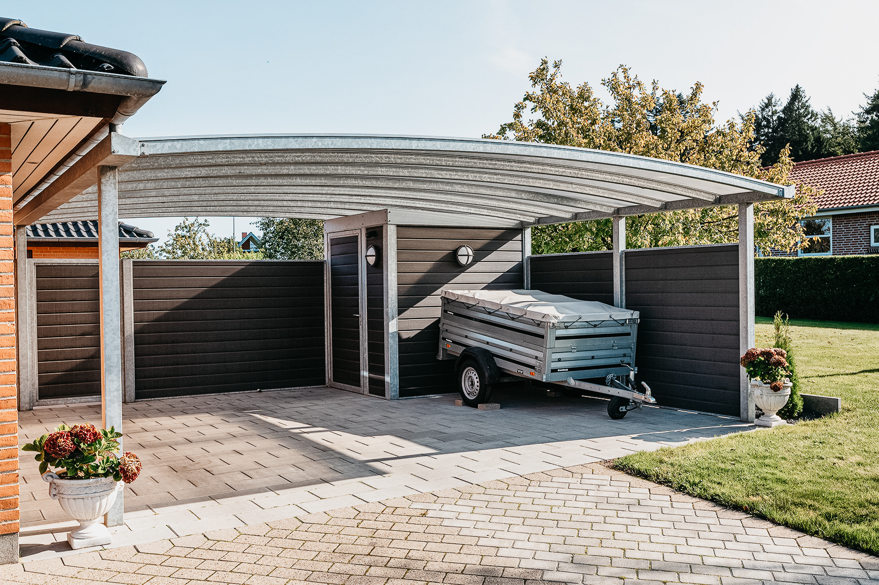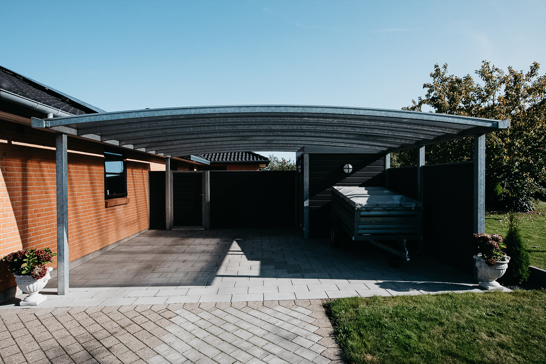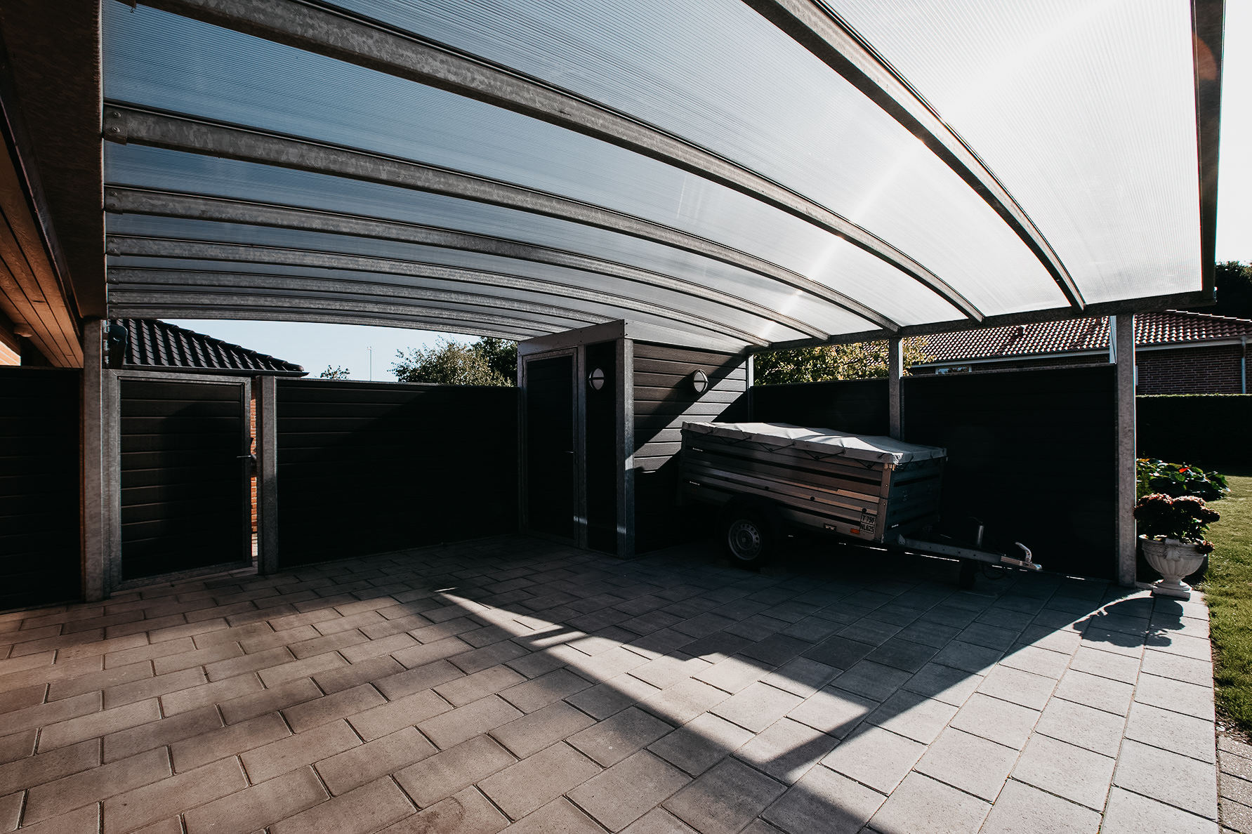 I Stoholm stod en familie over for den klassiske udfordring: hvordan får man maksimal opbevaringsplads til trailer, cykler og haveredskaber, uden at det går ud over carportens æstetik.