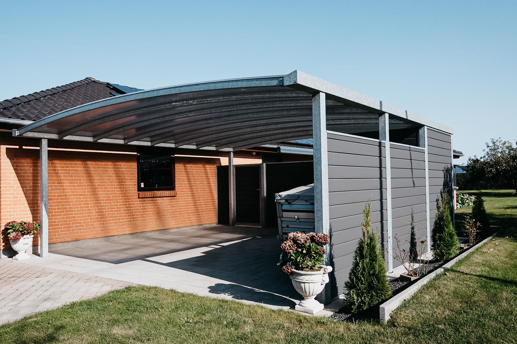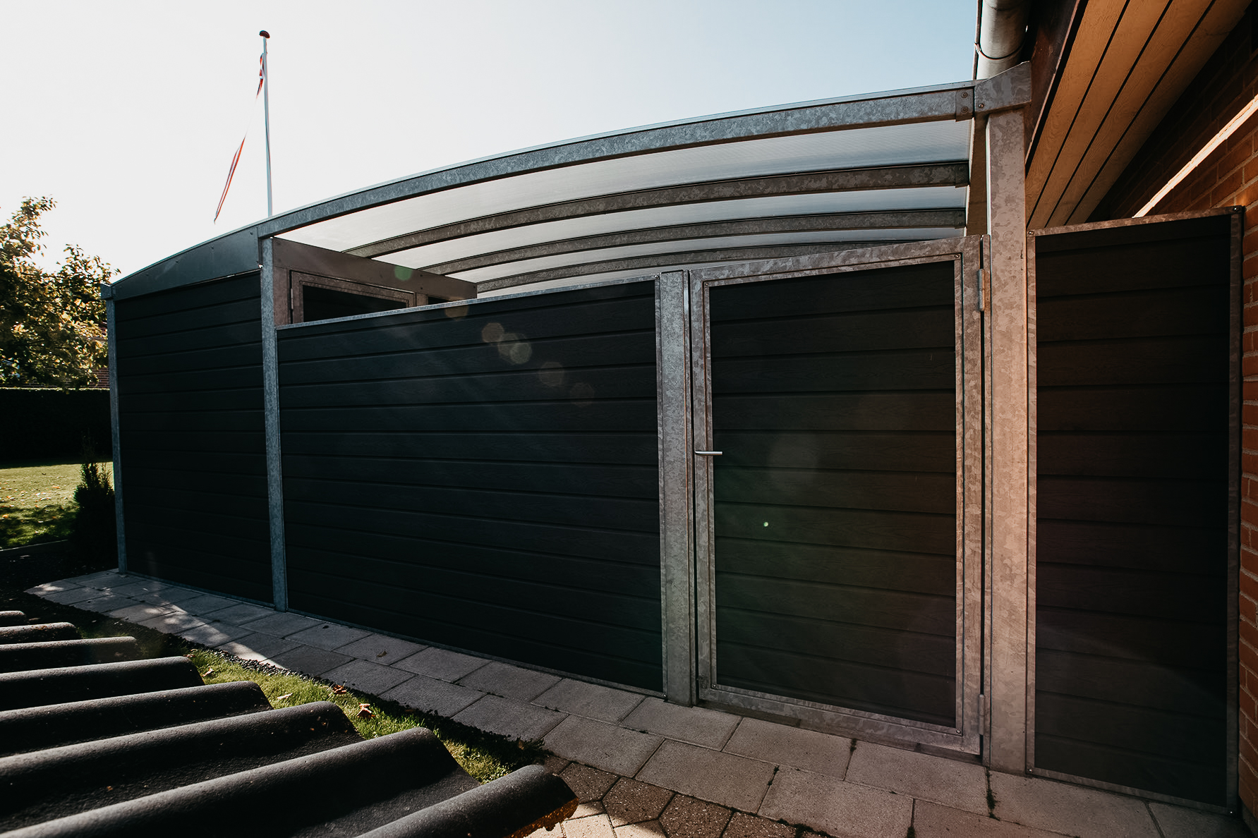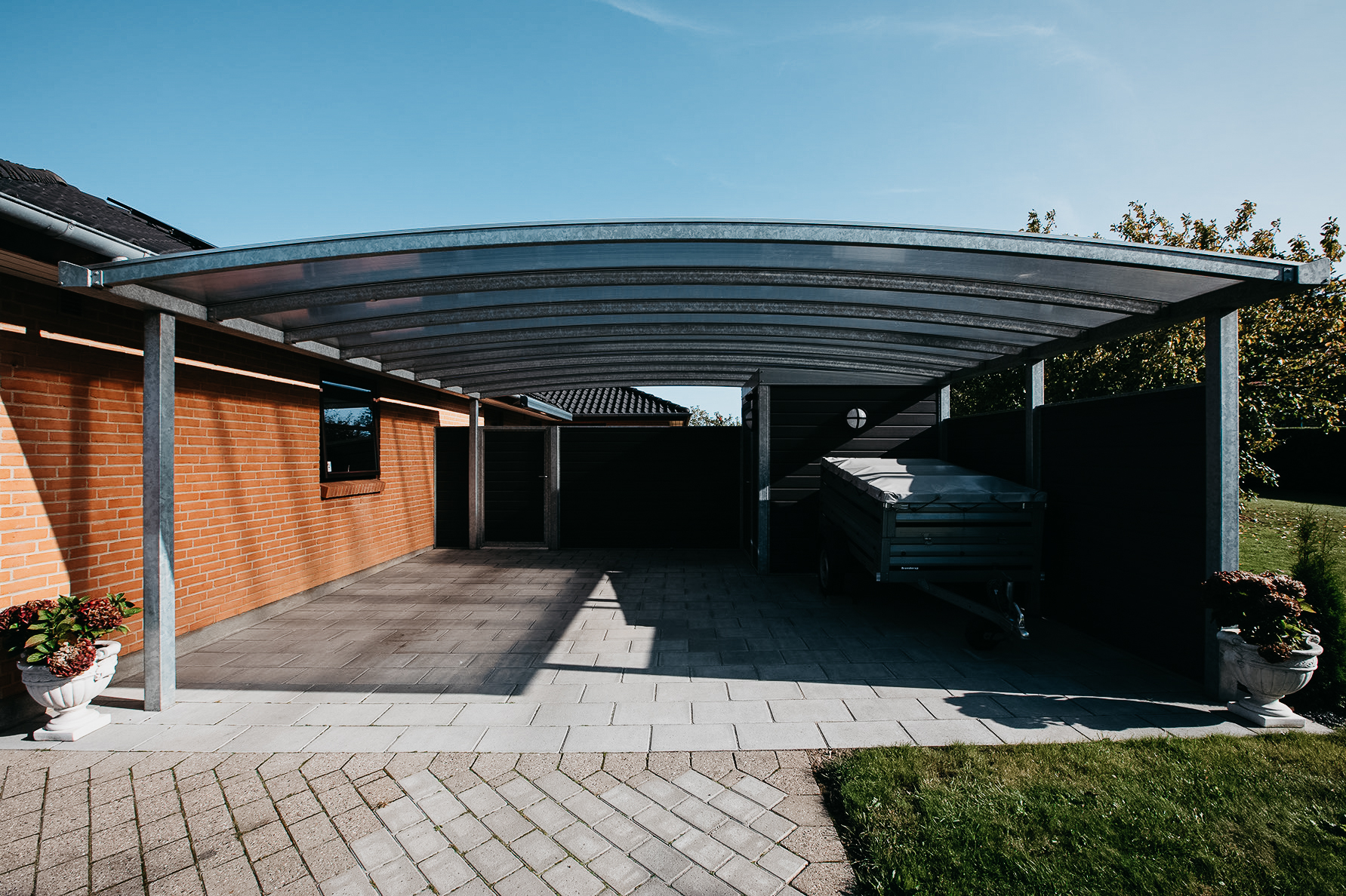 I Stoholm stod en familie over for den klassiske udfordring: hvordan får man maksimal opbevaringsplads til trailer, cykler og haveredskaber, uden at det går ud over carportens æstetik.