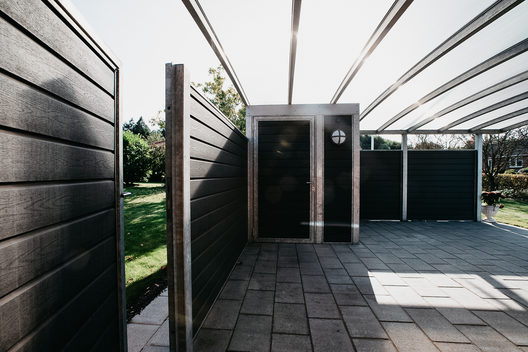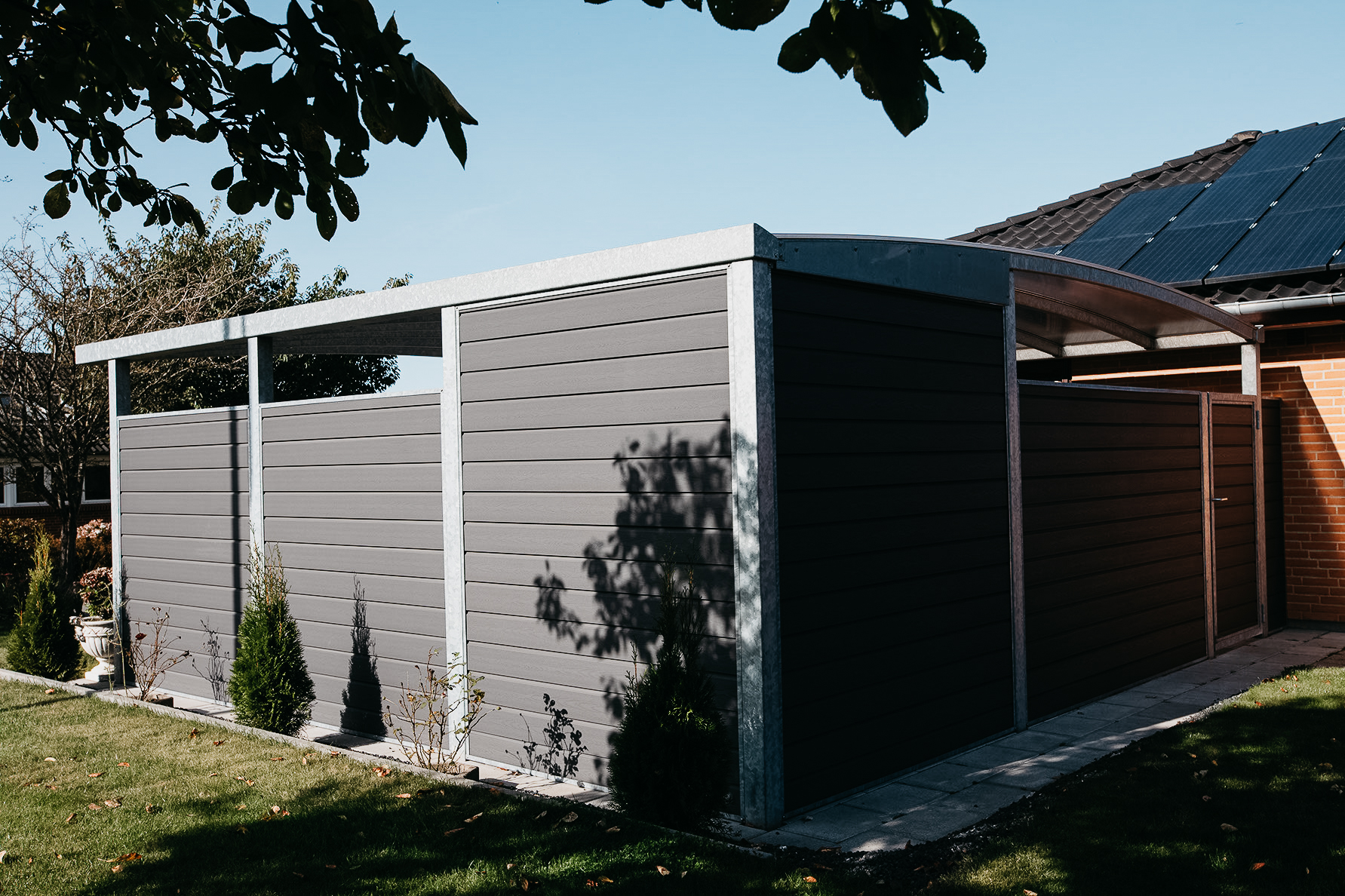 I stoholm var den primære udfordring at skabe en robust og elegant løsning, der dækkede et stort opbevaringsbehov. Vi leverede en carport med et fuldt integreret redskabsskur, hvor designet blev skræddersyet til at maksimere den praktiske plads. Løsningen er udført med en moderne og vedligeholdelsesfri kompositbeklædning, der giver et rent og ensartet udtryk, som passer perfekt til husets omgivelser.